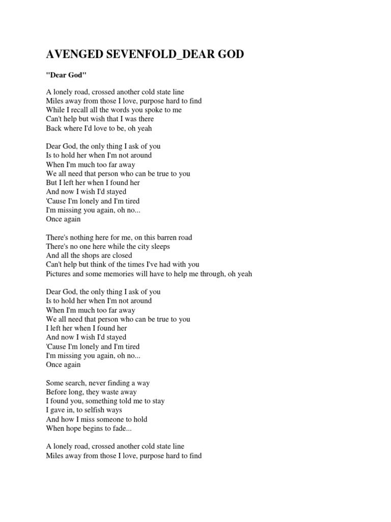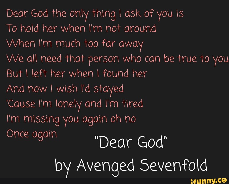 Dear God Im Tired / Dear god the only thing i ask of you is to hold her when i'm not around when i'm much too far away we all need that person who can be true to you but i left her when i found her and now i wish i'd stayed 'cause i'm lonely and i'm tired i'm missing you.