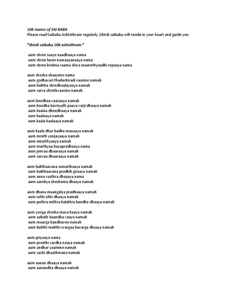 Pdf Sai Baba Ashtothram : Complete set of chapters of sai satcharitra in english is available for download also.